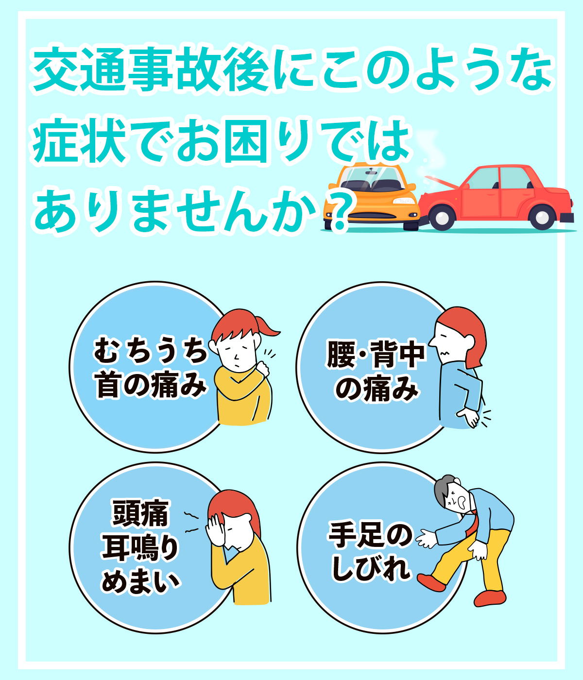 数日たってから痛みや不調を自覚するケースも多く、たとえ症状が軽くても、早めに適切な治療を受けることが大切です。