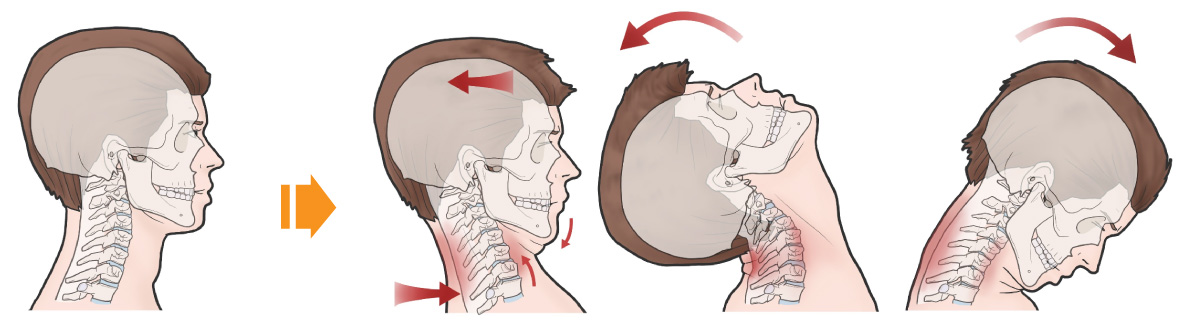 交通事故の場合首はムチのように 前後、あるいは左右に急激にしなる動きを起こします。