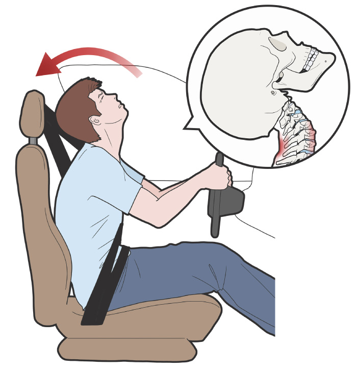 その結果、首の骨(頚椎)周辺の筋肉や靭帯に大きな負担がかかり、「むち打ち症(頚椎捻挫)」 を引き起こすことが多くなります。